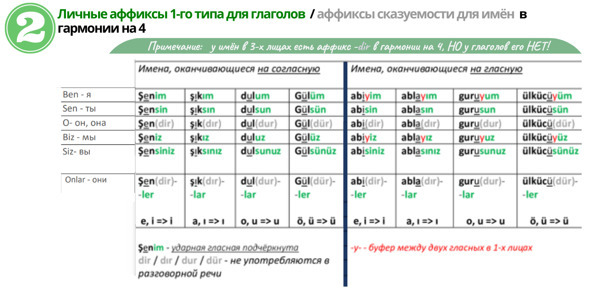 В каждом турецком предложении, равно как и в английском, должен быть глагол-сказуемое. Если в предложении нет глагола-сказуемого, на слове, не являющемся глаголом, далее на «имени» (имени существительном, имени прилагательном, имени собственном, местоимении, числительном, наречии, иногда на служебном слове), заканчивающем предложение должно быть аффикс сказуемости, например: