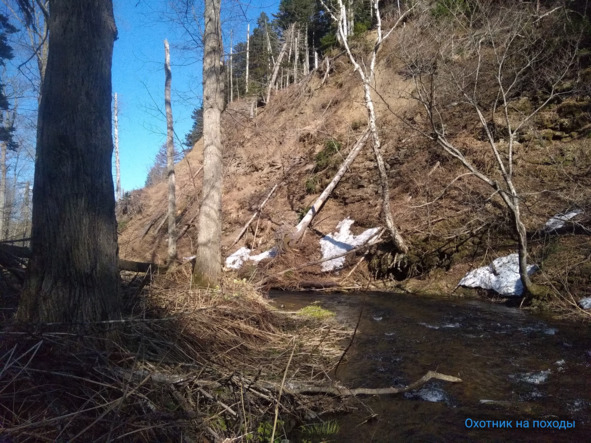 При входе в ущельице на себя обратил внимание странный обкусанный гребень длинной скалы, выглядело так, как будто-то кто-то из людей сделал это искусственно, но все же нет. Речка побежала обходить вытянутый скалистый берег. Вместе с ней, чертыхаясь брел и он. Вода была повышенного характера и приходилось ступать аккуратно у берега, местами прыгая по топляку. Ураганом посносило деревья со скальных, высоких берегов и деревья норовили ухнуться в реку, чтобы подзапрудить ее и доставить прохожему неприятности своими перегородками. В одном месте ему долго пришлось напрягать и тело и разум, чтобы пройти то, что пройти без захлебывания было нельзя. Удалось избежать неприятного и вскоре длинная скала была обойдена. Обкусанный участок ее наглядно высветился с другой стороны и стало понятно, что это точно природное образование и когда-нибудь это тонкое место, в считанные метры, будет съеден рекой окончательно и она, на радость будущим походникам, потечет совершенно прямо, минуя глупый обход скалистого отростка.