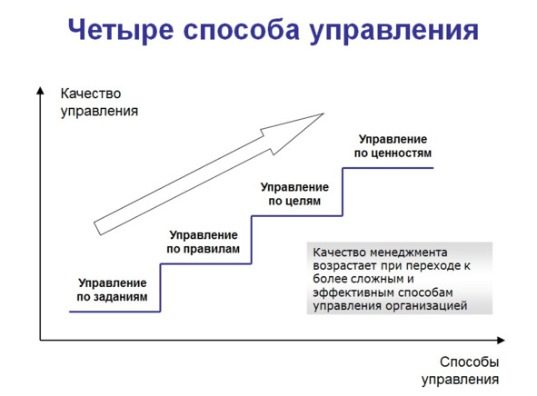 Выделяют четыре способа управления организацией, которые можно рассматривать как своеобразные ступеньки управленческого мастерства руководителей (рис. 1).