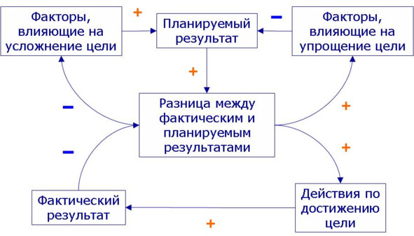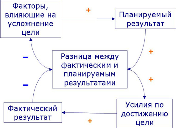 Все эти факторы при увеличении разрыва между «планом» и «фактом» как бы давят на цель «сверху», перемещая планку поближе к фактическому результату. Вместе с тем, давление на цель происходит не только «сверху», но и «снизу». Если цель достигается полностью или частично, т.е. разрыв между планируемым и фактическим результатами сокращается, то «включаются» факторы, влияющие на усложнение цели. Они способствуют тому, что планка цели поднимается вверх, и разрыв между «фактом» и «планом» вновь увеличивается. Это приводит к росту усилий по достижению цели, улучшению фактического результата, сокращению разрыва и ослаблению давления на цель в сторону ее усложнения.