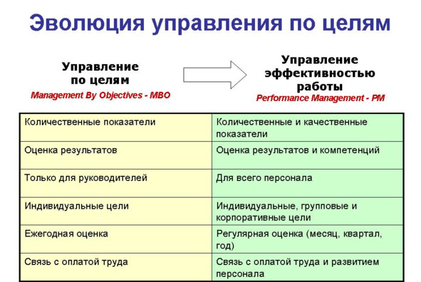 Но этот метод не безупречен. Он подвергался и до сих пор подвергается жесткой критике. Но под влиянием критики метод управления по целям постоянно совершенствовался, оттачивался, изменялся и преобразился настолько, что Питер Друкер, наверное, с трудом узнал бы свое детище. В процессе эволюции метода поменялось даже его название. В настоящее время вместо «Управление по целям Management by Objectives» чаще используют понятие «Управление эффективностью работы Performance Management».