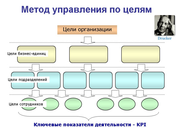 Метод управления по целям предназначен для уменьшения рассеивания и смещения целей и, как следствие, для продления жизни и достижения успеха организаций. Впервые эту идею озвучил классик современного менеджмента Питер Друкер в 50-х годах прошлого века. Почитайте его книги. Но ведь кто-то должен был сформулировать то, что уже «витало в воздухе» и стало насущной необходимостью.