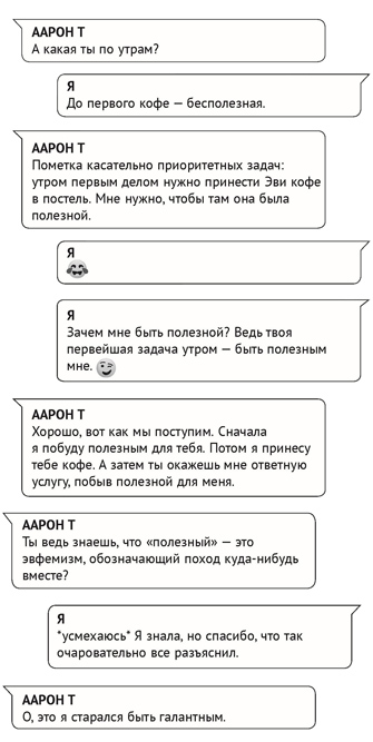 С Аароном мы общались четыре недели, но казалось, что намного дольше. Мы встретились в Сети, на сайте знакомств, а когда поняли, что у нас много общего (жажда путешествий, одержимость готовкой и передачами про ремонт, оба по-настоящему ценим Шекспира, любим тихие вечера дома и редкие шумные выходы в свет), то перешли на следующий уровень и стали отправлять друг другу сообщения в мессенджер.