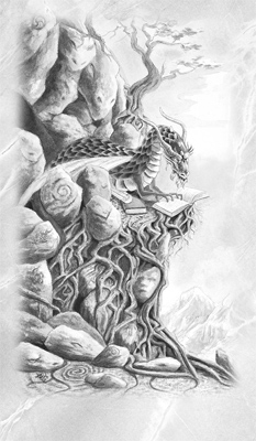 Большой, очень старый дракон сидит на горном уступе, вход в пещеру едва виден за его спиной. Когтями дракон держит древнюю книгу, которую прилежно изучает. Под его боком видны другие книги и свитки. Отшельник сознательно ищет уединения, ибо знает: только тогда, когда разум становится достаточно спокойным, приходит настоящая духовная осознанность и истинное понимание вещей. На камнях (основа и стабильность духовного развития) можно рассмотреть спирали, символизирующие находящиеся в постоянном движении потоки энергий созидания и разрушения. В скалах легко проступают черты лиц драконов и людей: они обозначают постоянное присутствие учителей из астрального мира. Также эти лица символизируют наши прошлые воплощения и события, которые мы пережили, чтобы достичь настоящего момента. Этот древний дракон знает: подобно прихотливому переплетению ветвей и камней вокруг него, жизненный путь редко бывает прямым и легким.