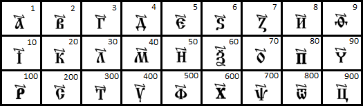 Думаю, что внимательный и подготовленный читатель обратил своё внимание на тот факт, что буквы, к которым привязаны стоянки Луны, имеют числовые значения. На приведённой таблице мы видим их соответствия. Для тех, кто впервые сталкивается с данным фактом, скажу, что не так давно всё исчисление на территории нашей страны записывалось буквами. Интересно, что слова «считать» и «читать», обозначающие для современного человека два разных процесса, пишутся почти одинаково, и, как оказывается, и сами эти два процесса не такие уж и разные, так как буквы и числа в какой-то степени смежные понятия.