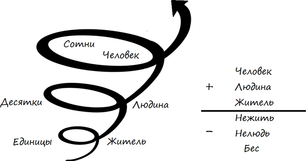 Надо сказать, что восходящая вверх спираль это не единственный путь, который может иметь место в Явном мире. Другой путь, обратный духовной эволюции, это деградация. Поэтому спираль может указывать и на нисходящий поток. Данная концепция прекрасно отображена в одной из тем АДУ, согласно которой есть три витка эволюционного роста человека в мире Яви это Житель, Людина и Человек. Эти уровни образно имеют каждый свой подвал. Подвалом Жителя будет Нежить, подвалом Людины Нелюдь, а Человека Бес. Эти уровни более подробно описаны в первой из книг цикла «Русская астрология» «Круг Стихий».
