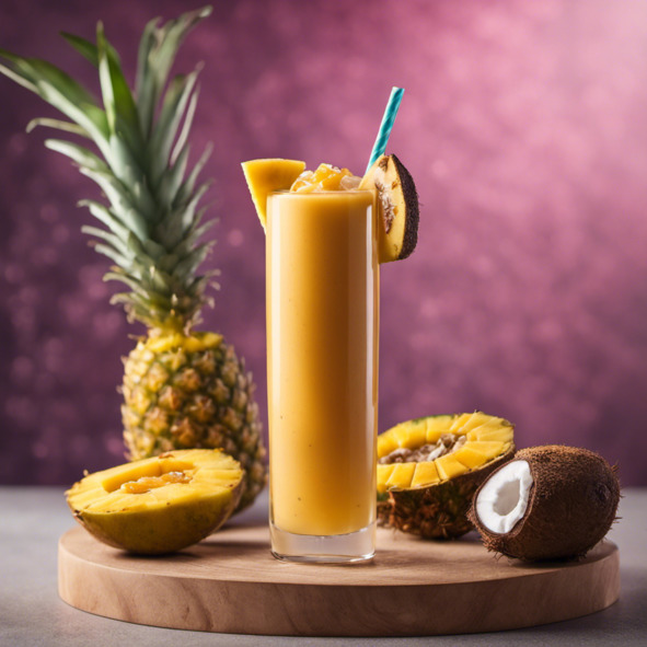 Подавайте в высоком бокале с кусочком ананаса на краю.