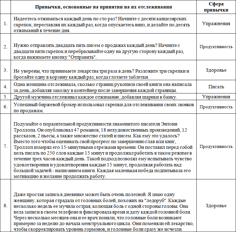 Вы поняли идею. Градация привычек это рассмотрение ваших целей и текущей средней скорости, а также размышление о том, как вы можете постепенно увеличивать свою производительность на постоянной основе. Когда дело касается наших привычек, то у всех нас есть средняя скорость. И если быть честными с самими собой, эта средняя скорость может быть намного медленнее, чем нам хотелось бы. Правда в том, что любой может получить мотивацию и заставить себя работать в течение одного дня, но очень немногие люди непрерывно прилагают постоянные усилия каждую неделю. Важно не осуждать себя и не чувствовать себя виноватым из-за того, что ваша средняя скорость ниже, чем вам хотелось бы. Важно осознавать, что на самом деле происходит, понимать, что это под вашим контролем, а затем принять тот факт, что небольшое, но последовательное изменение ваших повседневных привычек может привести к значительному увеличению вашей средней скорости. В вашем здоровье, работе и жизни для достижения невероятных результатов не требуются огромные усилия достаточно последовательных. Пришло время перейти на следующий уровень. Какая у вас средняя скорость?» (15)