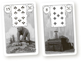 Например, на восьмой карте Ленорман, Гроб, изображена бубновая девятка. Ей чаще всего приписывают положительные значения, такие как успех, а также неожиданные перемены и материальное благополучие. Аналогию со значением Гроба здесь очень трудно разглядеть. Десятка треф, соответствующая Медведю, контрастирует с его приземленными атрибутами, такими как новые впечатления, путешествия, риск и переезд. Опять же, здесь можно говорить лишь о незначительных параллелях с Медведем. Скорее, эти значения подошли бы Кораблю.