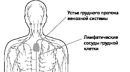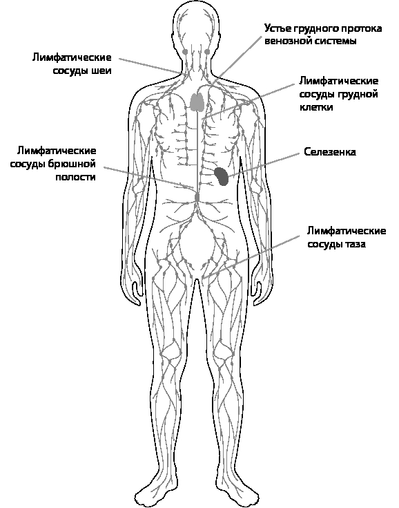 Капилляры собирают жидкость из межклеточного пространства и отправляют в сосуды, те, в свою очередь, соединяясь друг с другом в сеть, поднимают лимфу к лимфатическому узлу, а уж оттуда протоки собираются в один главный лимфатический проток, из которого лимфа сбрасывается в верхнюю полую вену. Это хорошо видно на схеме.