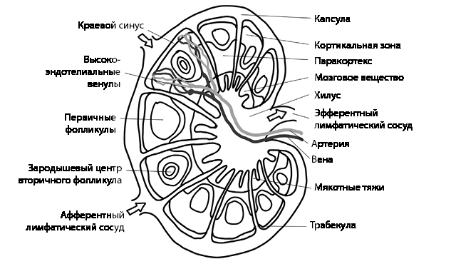 Именно в лимфатическом узле Т-лимфоциты проводят инструктаж В-лимфоцитов. И как мы помним, лимфа всегда движется от периферии к центру к главным сосудам большого круга кровообращения.