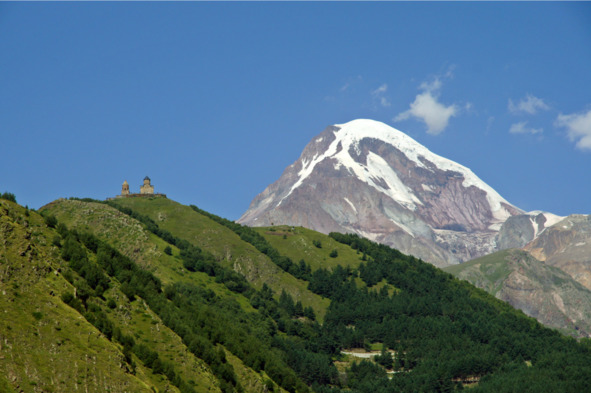 Казбек и церковь Святой Троицы фантастически смотрятся из поселка Степанцминда