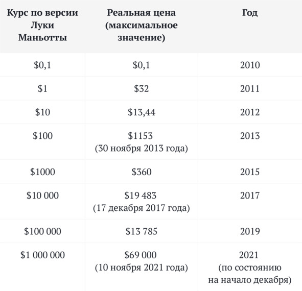 Каждый год цена на биткоин в среднем росла в 10 раз. От 0,1 доллара в 2010 году до 1 доллара в 2011 году, затем до 10 долларов в 2012 году и до 100 долларов в 2013 году. Затем рост немного замедлился стоимость увеличивалась в десять раз каждые два года: до 1000 долларов в 2015 году, до 10 000 в 2017 году, до 100 000 в 2019 году и до 1 000 000 в 2021 году.