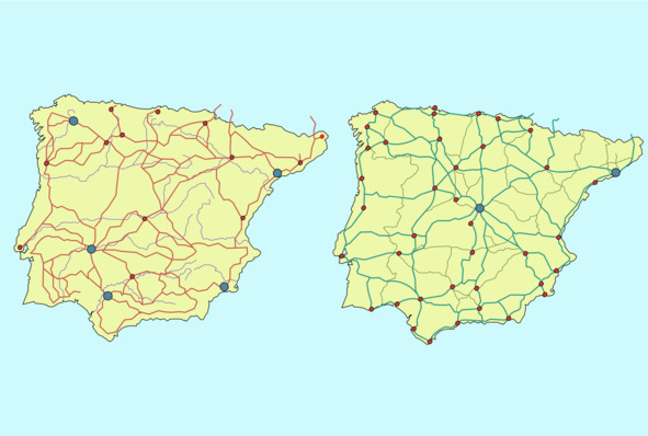 И раз уж речь зашла о фундаментальности, взгляните на карту римских дорог в Испании. А потом сравните ее с картой современных. Специально не буду пояснять, что и на какой картинке изображено, прекрасно видно, что огромная часть маршрутов используется и по сей день.