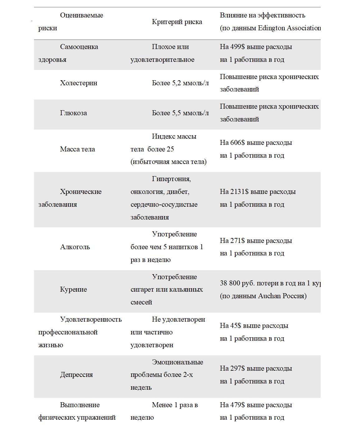 Таблица. Стоимость факторов риска для работодателя по данным Edington Association, 2020