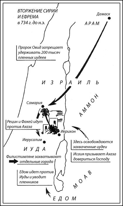 Ввиду того, что географическое расположение Иерусалима делало его стратегически важным для оборонительного союза, на царя Ахаза оказывалось всяческое давление с целью повлиять на его решение. Сирия и Ефрем (Израиль) напали на Иудею с целью сместить Ахаза и заменить его царём, который присоединится к коалиции. Несмотря на тысячи захваченных во время этого вторжения пленников, нападение не достигло своей цели. Царь Ахаз обратился за помощью к Феглаффелласару, и этот ассирийский царь не заставил себя долго ждать (4 Цар. 16:58).