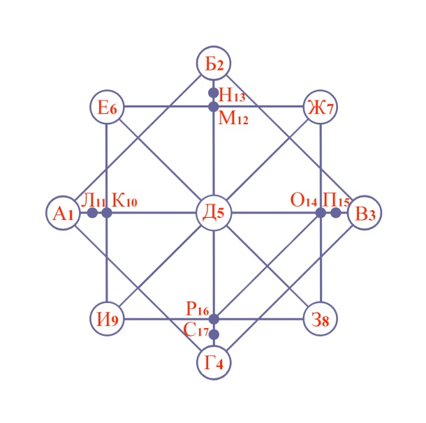 Эти задачи находиться у нас на четырех углах диагонального квадрата от точки (А) до точки (Г), всего их двенадцать, по три на каждый угол. Получается в кармические задачи души входят точки: А, Б, В, Г. Начиная с точки (А) идем по часовой стрелке до точки (Г). Для того чтобы их рассчитать мы складываем центр матрицы, точку комфорта (Д) с каждым углом диагонального квадрата, а затем полученное число еще раз складываем с угловой цифрой диагонального квадрата.