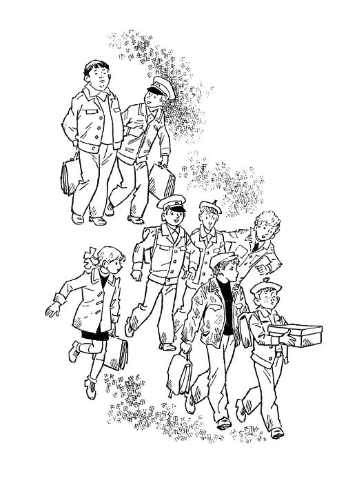 За Вовой, точно прикрывая его, широко шагал Андрей, большеротый, коренастый и сильный, в вытертой кожаной куртке, в которых обычно ходят летчики гражданского флота. Куртка была ему в самый раз. В отвисшем кармане ее тоненько звякали шахматы в коробочке; с ней он не расстается, и то и дело от него слышно: «Сыграем?» И расставляет фигурки. Сильно играет: несколько ходов и мат. За Андреем, толкая друг друга, торопились неразлучные Митя с Витей. У первого лицо репкой круглое, светлое; у второго будто морковка. Вытянутое, розовое. Рядом Стасик, самый низенький в классе, даже девчонок таких не было; однако ни рост, ни писклявый голос не помешали ему получить бронзовую медаль, присужденную в Индии за один из его рисунков. Сбоку, в коротеньком, пронзительно красном, как пожар, пальтеце с деревянными палочками-пуговицами вприскочку бежала Наташка. Это ее пальтецо резало Борины глаза.