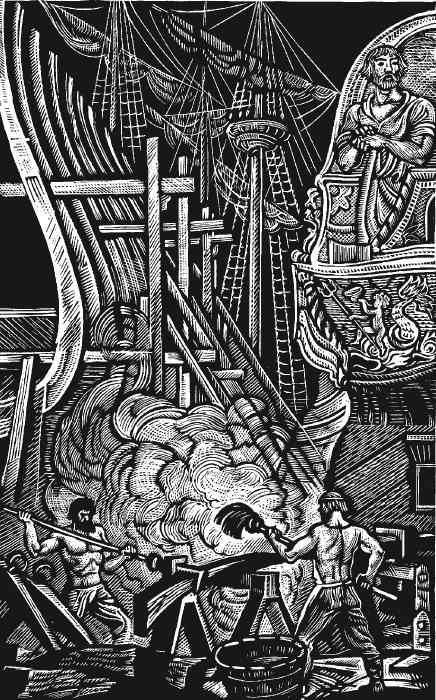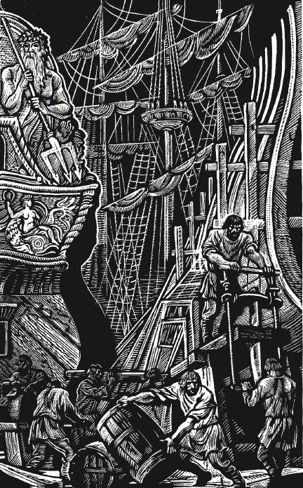 На верфи шла работа день и ночь. Заканчивали отделку сорокапушечного корабля «Крепость». Он покачивался высокой резной кормой и тремя мачтами у свежих свай стенки. К нему то и дело отплывали через реку ладьи, груженные порохом, солониной и сухарями, причаливали к его черному борту. Течением натягивало концы, трещало дерево. На корме, на мостике, перекрикивая грохот катящихся по палубе бочек, визг блоков, ругался по-русски и по-португальски коричневомордый капитан Памбург усищи дыбом, глаза как у бешеного барана, ботфорты в грязи, поверх кафтана нагольный полушубок, голова стянута шелковым красным платком. «Дармоеды! Щукины дети! Карраха!» Матросы выбивались из сил, вытягивая на борт кули с сухарями, бочки, ящики, бегом откатывали к трюмам, где хрипели цепными кобелями боцмана в суконных высоких шапках, в коричневых штанах пузырями.