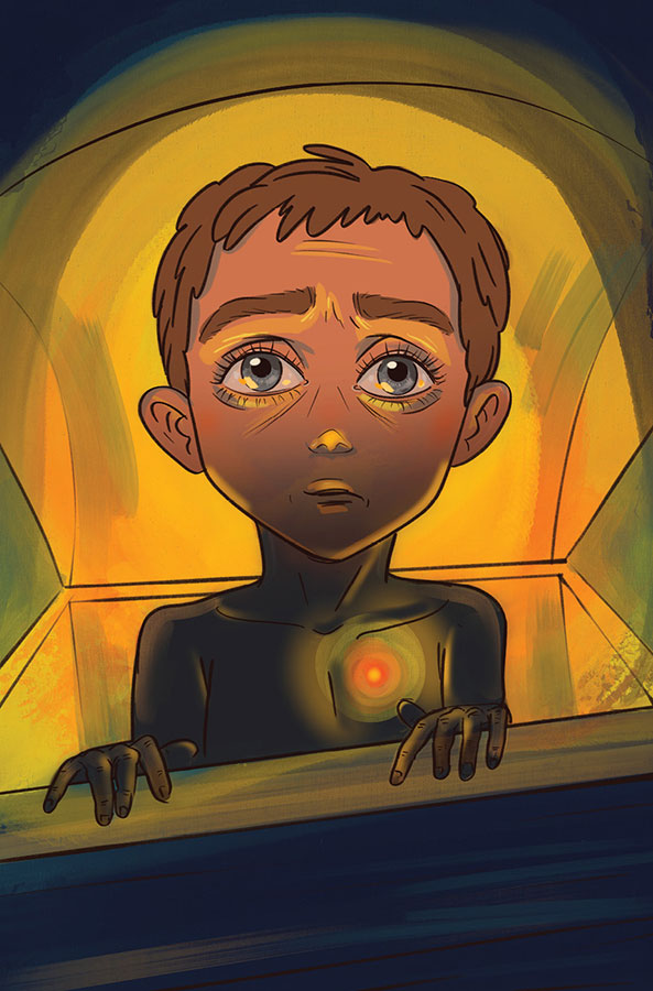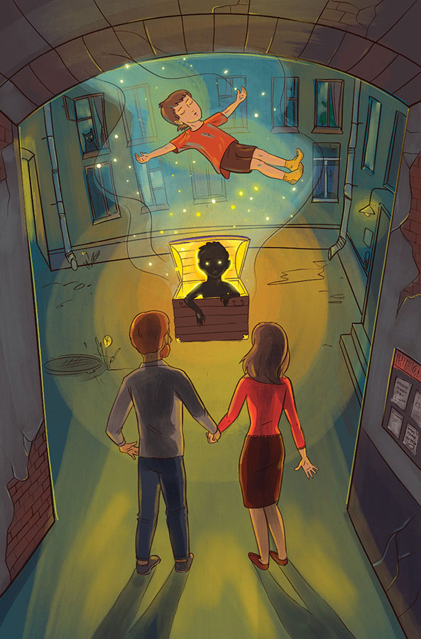 Они держались за руки и шли быстро-быстро. Дошли до арки, в которой было очень темно. Тоннель, ведущий к внутреннему двору, казался длинным и мрачным. Они шагнули в темноту и бесстрашно пошли вперёд. Вдруг перед ними появился двор, посередине стоял сундук. Из него виднелась голова маленького монстра. В невесомости над сундуком парил их сын. Руки его были раскинуты в стороны, глаза закрыты. Казалось, что Виктор умирает. Его мама почувствовала такую боль в сердце, что ей пришлось сесть прямо на асфальт.