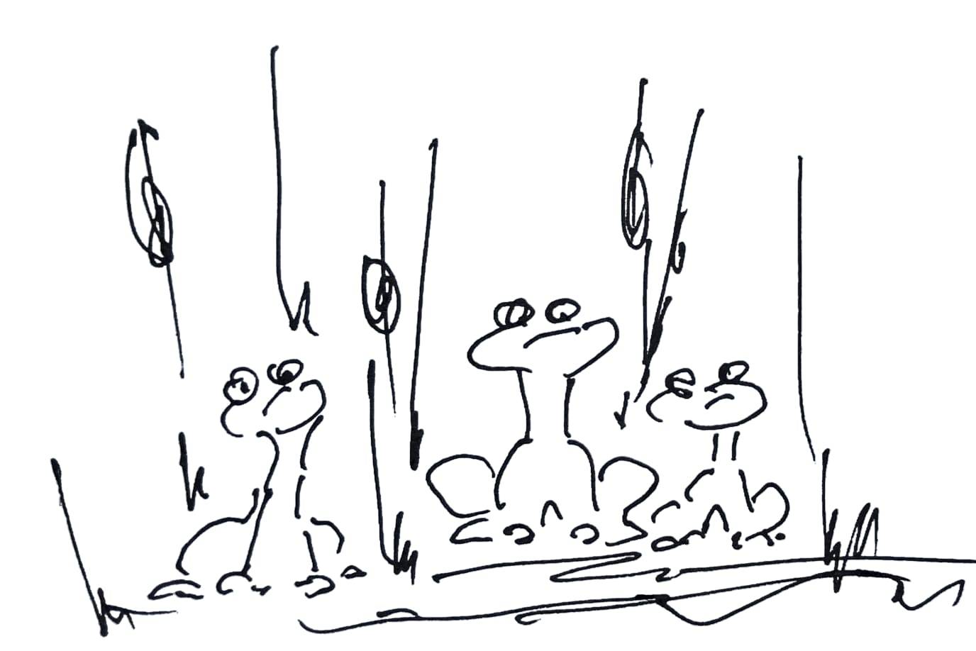 Смех прекратился и из камышей вылез маленький лягушонок. Тут утка вспомнила, что уже видела здесь лягушат и даже сделала им замечание, чтоб не лезли под ноги. Однако, маленькие негодники её не услышали.