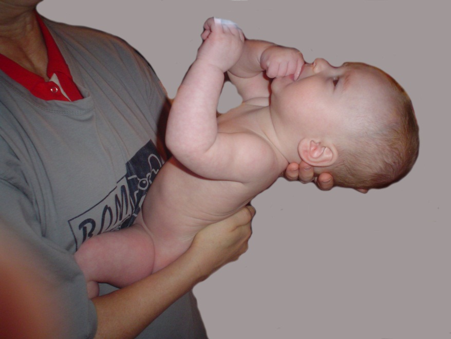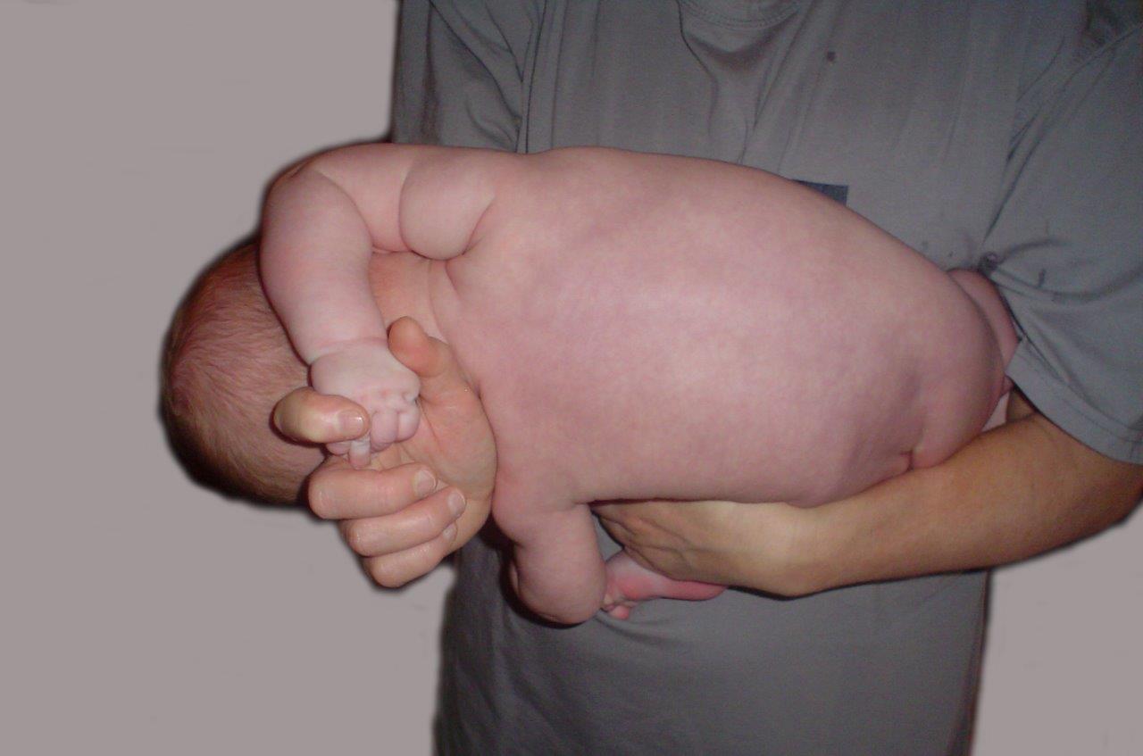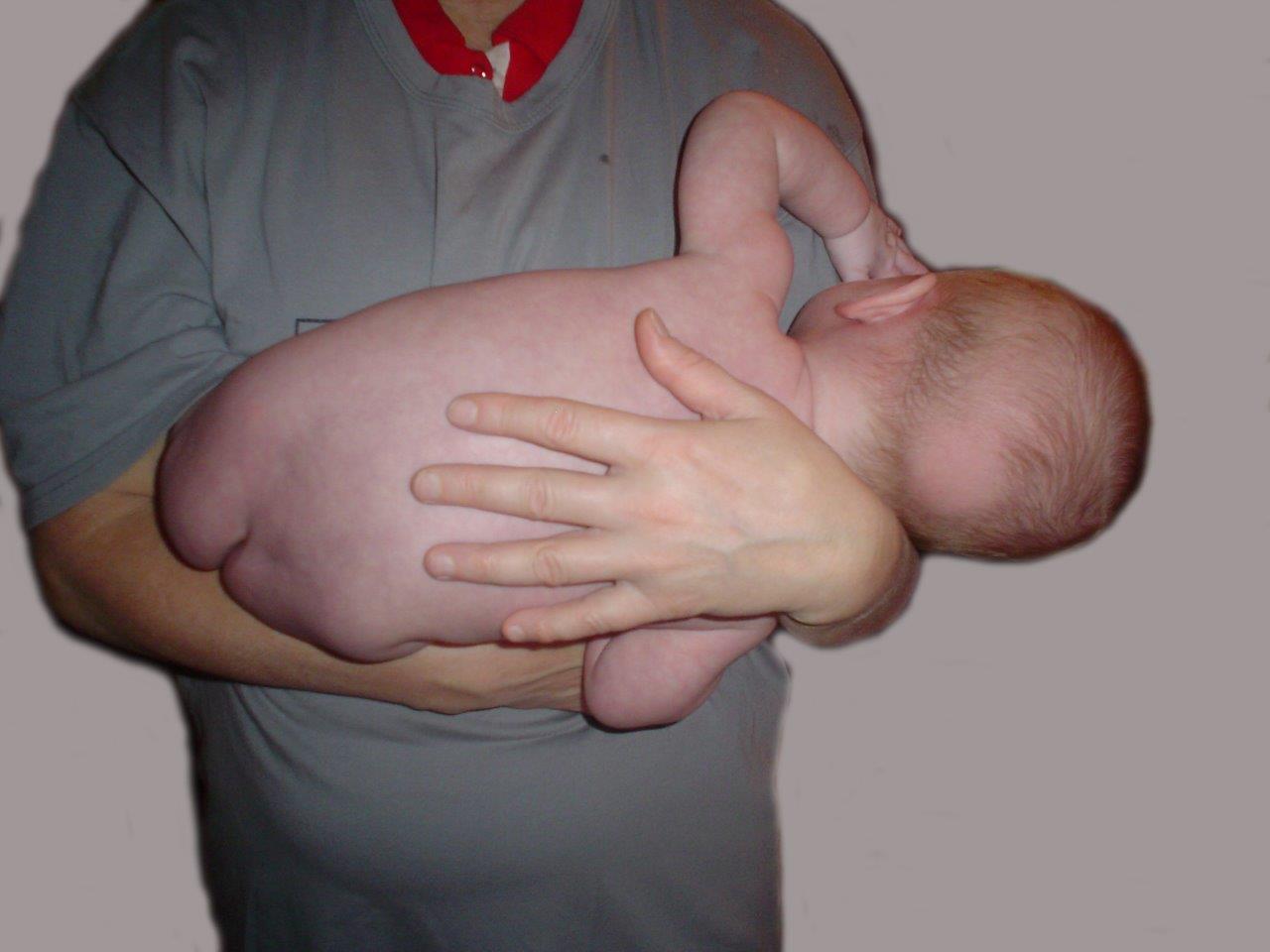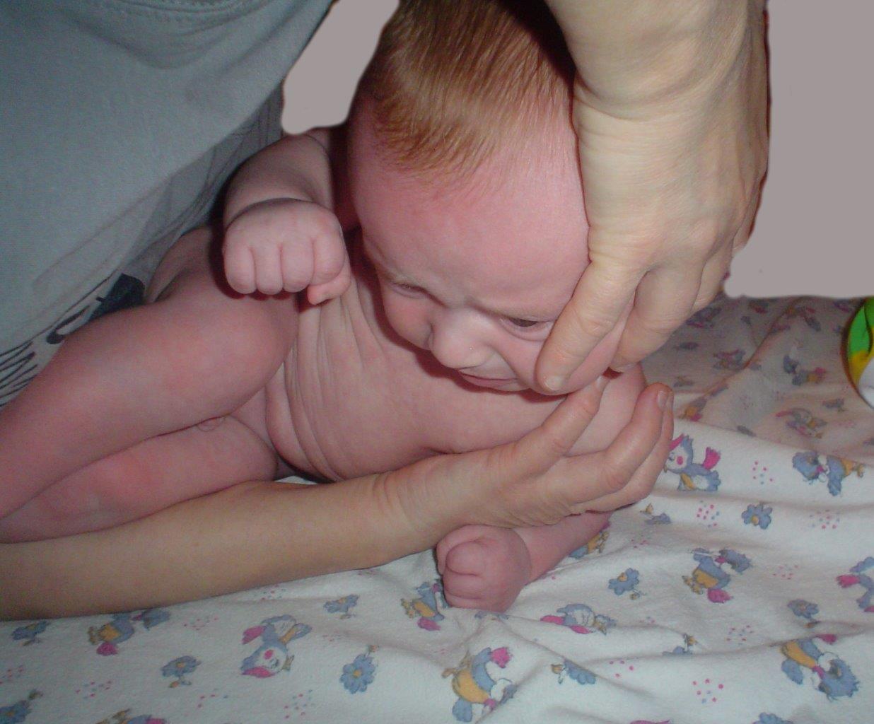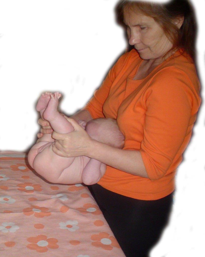 2.Возьмите ребенка спиной к себе, поддерживая под колени (35 сек). Колени старайтесь поднять на уровень лица ребенка. Делать несколько раз в день. Называется «Поза эмбриона» (фото 2).