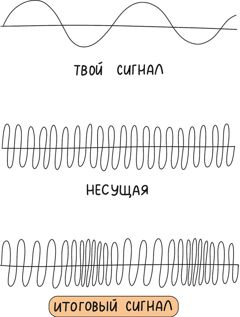 Волны бывают с высокой частотой и низкой. Волна с высокой частотой легко справляется с препятствиями, а волна с низкой не сможет преодолеть большие преграды на своём пути. Поэтому, чтобы передавать по воздуху любую информацию, её волну «перемножают» с простой высокочастотной волной, которую называют «несущей», потому что она как бы несёт на себе всю информацию, которую мы хотим передать по воздуху на большое расстояние и обогнуть все препятствия.