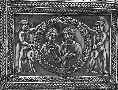 Илл. 7. Свадьба аристократа IV века. Жених и невеста, может быть, и были христианами, но само (великолепное) мероприятие было откровенно языческим. Фрагмент крышки свадебной шкатулки «Секунда и Проекты». Британский музей, Лондон. © The Trustees of the British Museum.