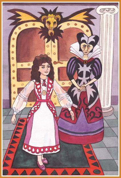 Азарина зашла в хижину и увидела, что находится внутри богатого замка со множеством различных дверей, а сопровождающая её женщина неожиданно превратилась в страшную и безобразную старуху, одетую в дорогие чёрные, сверкающие наряды. Единственное, что осталось в ней прежнего, это блеск холодных глаз. Азарина отпрянула назад и хотела выбежать из волшебной хижины-дворца, но дверь, в которую они вошли, исчезла!..