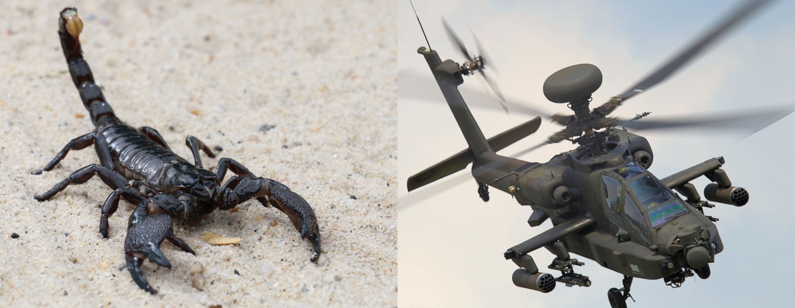 Глеб сразу же вспомнил современную военную технику. Чтоб получить нечто похожее, нужно взять саранчу, у которой крылья находятся сверху, то есть, лежат на спине, и приделать к ней клешни и хвост скорпиона, жалом вперёд. Благодаря такой операции, получится боевой вертолет с винтом на корме и боковыми подвесками для размещения бомб и ракет.