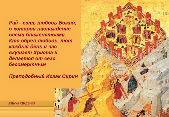 Рай есть любовь Божия, в которой наслаждение всеми блаженствами, где блаженный Павел напитался преестественною пищею и, как скоро вкусил там от древа жизни, воскликнул, сказав: ихже око не виде, и ухо не слыша, и на сердце человеку не взыдоша, яже уготова Бог любящим Его (1Кор.2:9). От древа сего был отстранен Адам советом диавольским. Древо жизни есть любовь Божия, от которой отпал Адам и с тех пор не встречала уже его радость, но работал и трудился он на земле терний. Лишенные любви Божией, если и по правоте ходят, едят тот хлеб пота в делах своих, какой повелено было есть первозданному по отпадении (от любви Божией) его. Пока не обретем любви, делание наше на земле терний, и, хотя сеяние наше бывает сеянием правды, однако и сеем, и пожинаем мы среди терний и ежечасно уязвляемся ими и, что бы ни делали к своему оправданию (сколько бы ни совершили дел правды), живем в поте лица. А когда обретем любовь, тогда станем питаться хлебом небесным и укрепляться в силах без работы и труда. Небесный хлеб есть Христос, сшедший с небесе и даяй живот миру (Ин.6:33), и это есть пища ангельская.