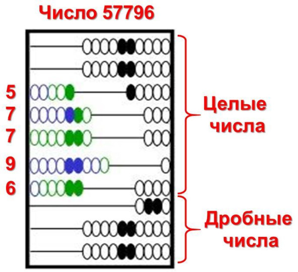 Пруток с четырьмя косточками и нижерасположенные прутки счётов символизировали дробные части чисел. Прутки, расположенные выше прутка с четырьмя косточками, символизировали целые числа.