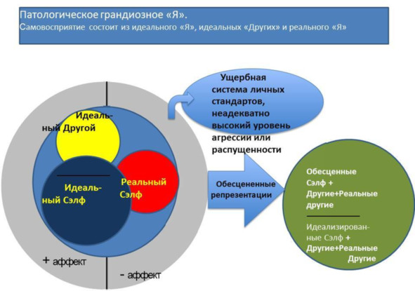 Патологическое грандиозное Я. Эгоцентризм и исключительное право. Чрезмерная зависимость от восхищения. Фантазии об успехе и грандиозности. Амбиции. Избегание противоположных реальностей Приступы неуверенности