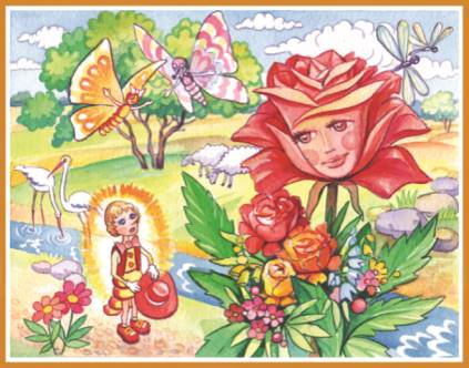 Розочка радостно помахала своими листочками, бегущему по камушкам, Ручейку, а тот, улыбнувшись ей в ответ, запел песенку: