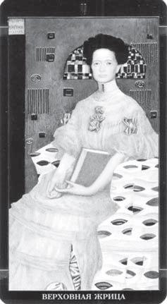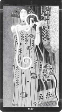 В сюжетном ряду Великих Арканов Золотого Таро Климта мужские фигуры встречаются значительно реже женских. Там, где это происходит, они нарочито лишены атрибутов мужского доминирования. Исключением является Верховный Жрец, в образе которого выступает сам Климт единственный мужчина, закономерно удостоенный благосклонности всеобъемлющей женственности. Но и он Жрец, чей оплодотворяющий потенциал переведен в духовное измерение. Прочие мужские характеры Великих Арканов фрустрированный Отшельник да перепуганный Дурак. Напротив, женские характеры в Великих, да и в Малых Арканах выписаны особенно рельефно и наделены привлекательными и отчетливо силовыми характеристиками. Первым в ряду таких мощных характеров выступает Маг, явленный в образе женщины.