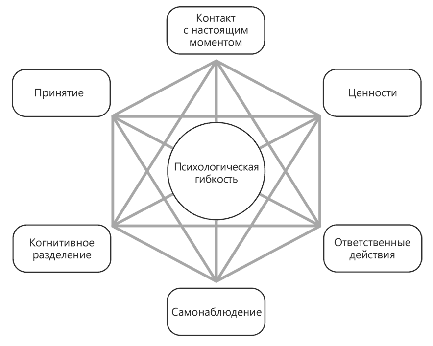 Терапия принятия и ответственности объединяет шесть ключевых процессов, известных под названием «гексафлекс ТПО», которые помогают развивать психологическую гибкость: самонаблюдение, контакт с настоящим моментом, принятие, когнитивное разделение, совершение ответственных действий и определение своих ценностей. Каждый из них предполагает развитие определенных навыков, и все они взаимосвязаны друг с другом, и потому совершенствование одного навыка ведет к улучшению остальных. Во второй части книги мы подробно рассмотрим каждый из этих принципов с точки зрения комплекса осознанных действий и попробуем внедрить ТПО в повседневную жизнь. Последняя часть книги посвящена обсуждению данных навыков и «собиранию» КОМПАСа, который поможет вам в вашем путешествии. Для начала же давайте выясним, что представляют собой эти шесть составляющих гексафлекса ТПО и как они связаны с КОМПАСом.