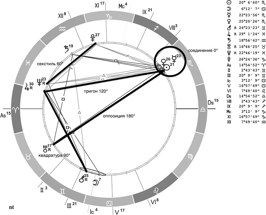 Представьте, что два парня подрались в школе, а учитель им говорит: «Пожмите руки и помиритесь». Как вы думаете, как они пожмут друг другу руки? В знак примирения или потому что обстоятельства так сложились? Не думаю, что ребята сразу после рукопожатия станут лучшими друзьями. Но плохой мир лучше хорошей войны. С аспектами планет то же самое. Есть аспекты «хорошего мира», когда взаимодействующие планеты дружат и их еще и примиряют, есть аспекты «плохого мира», когда взаимодействующие планеты не дружат, но между ними есть примиряющий аспект. Такие аспекты называются гармоничными тригон и секстиль здесь взаимодействие планет примиряет. Тригон (трин) 120° это обнимашки, не просто пожать руку, но и еще похлопать по плечу/обнять/заключить договор. Секстиль 60° это кивок головы или «помахать ручкой». Аспект квадратуры (квадрат) 90° и оппозиции 180° это война. Но какая война? Хорошая или плохая? Хорошая война квадрат между дружественными планетами. Плохая война квадрат между недружественными и любая оппозиция. Квадратура это аспект напряжения, а оппозиция всегда аспект войны. Поэтому даже дружественные планеты не договорятся. Поэтому оппозицию избегайте вообще (=не начинайте дела, когда есть оппозиция у планеты-сигнификатора[7]). Есть еще аспект соединения 0°, когда планеты обнимаются, и он напрямую зависит от дружбы и вражды планет. Если планеты враждуют, то в объятиях могут задушить друг друга. Если планеты дружат, то такие объятия будут самыми теплыми и нежными.