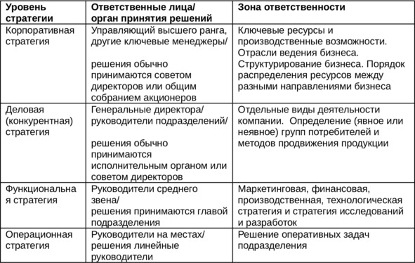 Выделяют четыре уровня стратегий (Маркова, 2007). Данная классификация применяется при постановке целей и разработке соответствующих регламентирующих документов.
