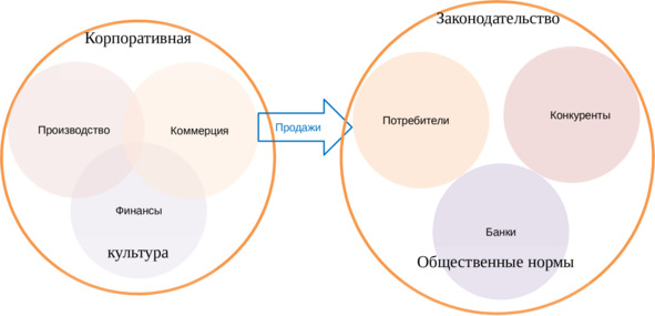 Предлагаю пойти по пути, который так импонировал всем хорошо известному Шерлоку Холмсу. Воспользуемся дедукцией. Разделим обстоятельства, влияющие на продажи, на внутренние и внешние. Обратимся к визуальному представлению. Включим набор соответствующих причин в один из двух кругов (Рис. 1).