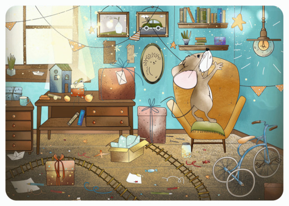 He quickly tucked in his crib and looked around the room filled with open gift boxes. Nodding to himself in satisfaction, the mousey began to walk from one gift to another, taking out and examining the toys. A happy smile lit up his contented face brighter and brighter.