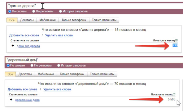 Поэтому давайте вернемся к нашему мужчине, который будет искать наши материалы из дерева. И вобьем запрос «дом из дерева». Да, здесь нужно понимать, что для поискового робота «деревянный дом» и «дом из дерева» это разные запросы. Доказательство тому частота поисковых запросов, она разная, убедитесь.