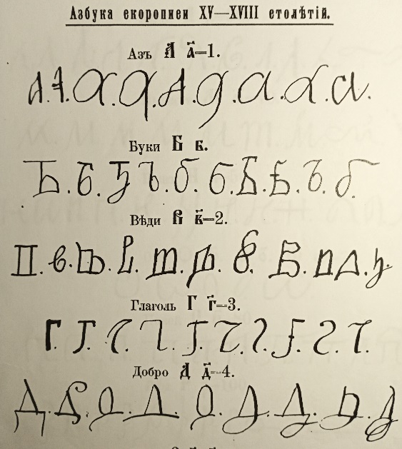 Но повезло, что крестьяне Успенского прихода принадлежали монастырям, и при передаче сёл от Брянских монастырей Московскому Даниловскому произведена полная опись крестьян. Чтобы разобраться в древних бумагах московских архивов, двоюродному брату Николаю Шамарову целый год пришлось осваивать древнерусскую скоропись. На фото 7 фрагмента из книги И.С. Беляева «Курс древнерусской скорописи» приводится до десяти способов графического изображения каждой буквы азбуки в почерках переписчиков того времени.