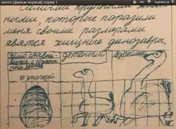 Но вернемся к фактам. В фильме есть только фото ребенка на лошадке, со звездочкой октябренка в школе. И абсолютно никакого фактического материала, подтвердившего бы какую-то необычность Славика. Нет ничего говорившего бы о том, что это не простой советский ребенок. Из фактов еще представлена страница из дневника ребенка, где он нарисовал динозавров.