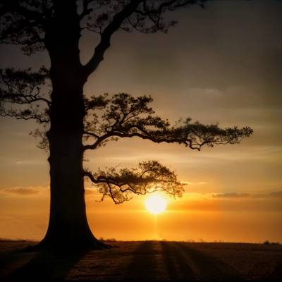 A highly realistic photography landscape with a quaint-looking leafless tree at the time of sunset when the sun is quite near the horizon. The sun rays play in the tree branches and make everything look golden. In the upper part of the pic there are gorgeous transparent clouds in the sky. Stunning minimalistic composition with interesting details; all the parts of the depiction are perfectly balanced. Professional camera with best settings for the golden hour pics. Shallow DOF. The picture has certain mystic atmosphere and charms the viewer with its divine beauty. Masterpiece. High res, 4k, -testp, -beta beta -upbeta.