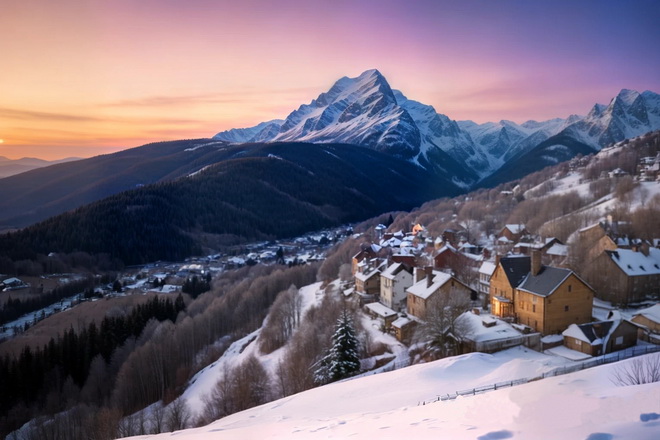An atmosphere of complete peace and tranquility; the mountain landscape evokes a sense of awe and quiet inner delight. The timeless beauty and majesty of the moment of sunrise in the mountains is expressed with great inspiration by the use of light and shadow, giving the scene dramatic and bright character.