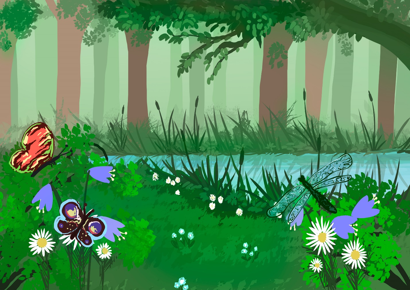 А рядом доносятся звуки ручейка, вода в нём чистая и прозрачная. Ручеёк звучит ласковой музыкой. А над ним пролетают, звеня крылышками, стрекозы.