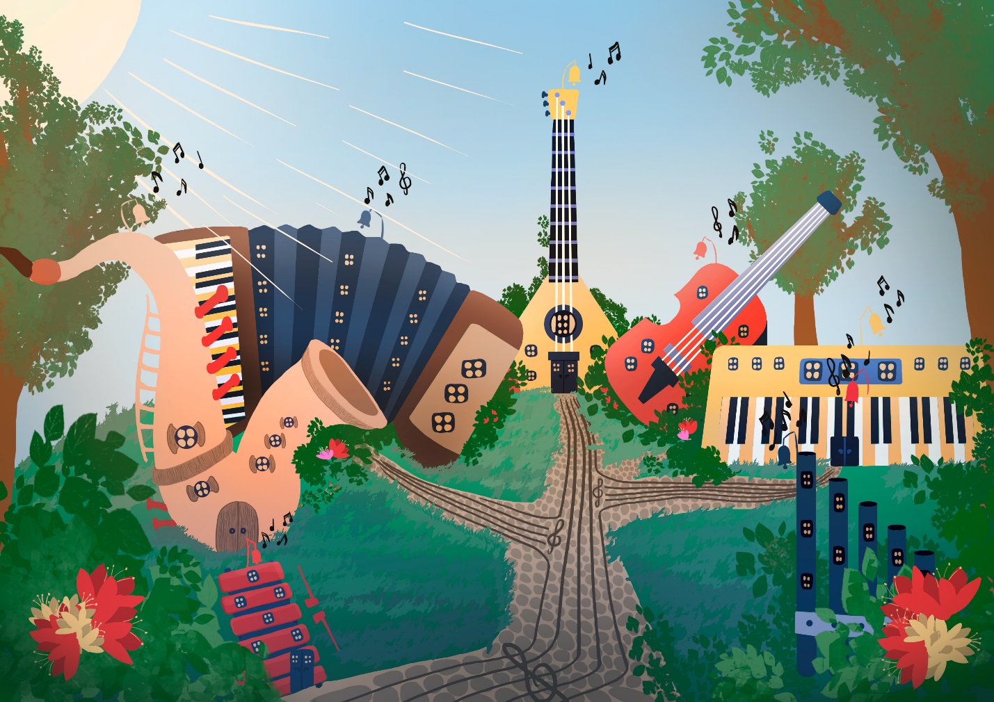 Дома в Музыкодилии стоят чудной формы, они напоминают разные музыкальные инструменты, а в них уютно и светло. На крыше каждого дома висят колокольчики. И когда в ночном небе загораются звёздочки, колокольчики передают попутному ветру колыбельную музыку от дружной семьи нот.