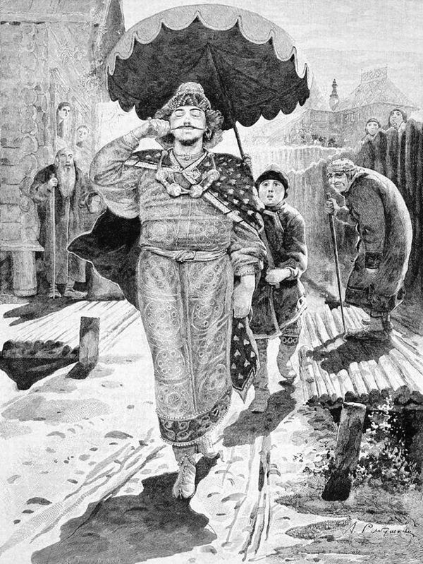 Много их сидит на богатырской скамье; не по аристократическому праву породы занимают они это почетное место. Аристократическое понятие, образовавшееся на Западе рыцарством, не существовало в Древней Руси. На богатырской скамье сидит и Ставр, богатый боярин, и Алеша, сын попа, и Иван, сын гостя (купца), и, наконец, Илья Муромец, крестьянин. Всем им ровный почет. Двор князя Владимира всегда открыт: на дворе его княженецком врыты дубовые столбы, в столбы ввернуты булатные кольца. Приезжает богатырь, привязывает ретивого коня к булатному кольцу, потом идет в светлую гридню, молится Спасову образу, кланяется князю со княгинею и на все четыре стороны. Этот последний, общественный, всем равный поклон, невольно рисующий множество народное, удержался и доныне. Великий князь спрашивает богатыря о роде и племени, велит поднести или сам подносит турий рог меду сладкого. Богатырь выпивает, садится на богатырскую скамью и пирует. Среди пированья, в тот час, как будет день в половину дня, будет пир в полупире, Владимир-князь распотешится, ходит по своей гридне, расчесывает черные кудри и предлагает подвиги богатырям. Один из них вызывается, выпивает подносимую чашу, и тогда