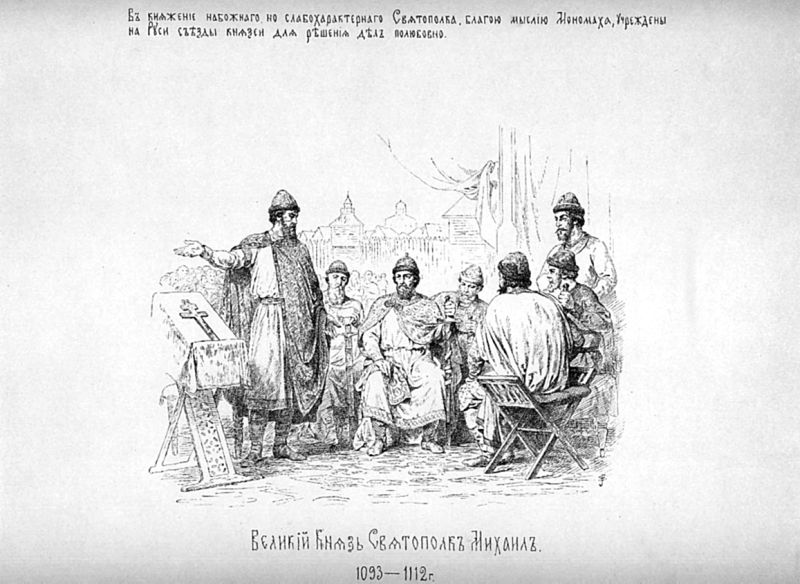 Теперь перейдем к потомству Изяслава. Он владел Киевом, и Киев достался по череде старшинства сыну его, Святополку-Михаилу, но старший сын Святополка, Ярослав, умер в 1123 г., не владея Киевом, который принадлежал еще старшему, дяде его, Мономаху. Потомство его, следовательно, утратило по этому случаю право свое на Киев.