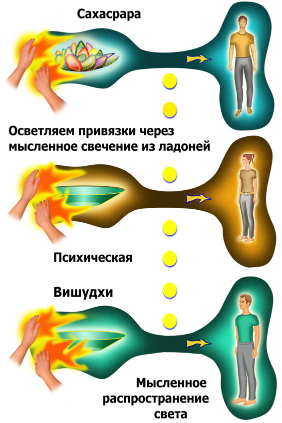 После произнесённых слов представляем, как умерший человек начинает светиться ярким светом, и постепенно уходит вверх вместе со своими Ангелами. Мы, же, продолжаем засвечивать привязку. Если же вам по разным причинам визуализация или фантазия затруднительны, то просто произносим призыв умершего и обращение к нему. Вне зависимости от того, смогли вы его представить или нет, если он реально существует, то он придёт, и после вашего обращения уйдёт в Свет. Визуализация лишь ускоряет процесс. Между прочим, отпускание умерших действенно во всём диапазоне времён существования Рода, или тех Родов, в которых воплощался человек в прошлых жизнях. Это относится и к древним, умершим от действия Рода, людям, и к умершим настоящего воплощения, по тем или иным причинам организовавшего привязку к отрабатываемому человеку. Работу с умершими мы можем увидеть на рисунке 7. на примере с чакрой Сахасрарой. Теперь о цикличности работы с привязками от умерших людей. Привязок такого рода может быть и очень много, и очень мало. Мало ни одной, много сотни. Всё определяется индивидуальными наработками человека. Поэтому в данной методике с целью экономии времени мы предлагаем отрабатывать для каждой чакры примерно по пять привязок, если мы проводим комплексный сеанс. Если же мы работаем целенаправленно с какими-либо болями или нарушениями, то работа может быть более длительной, например, мы отпускаем около сотни умерших.